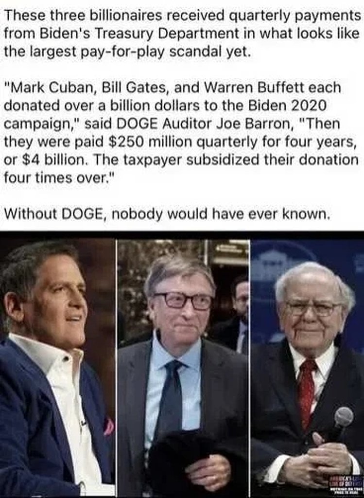 Thanks to DOGE it has been revealed that Buffett (along with Mark Cuban and Bill Gates) each received $4 Billion dollars for their $1 Billion dollar campaign donation to Joe Biden.