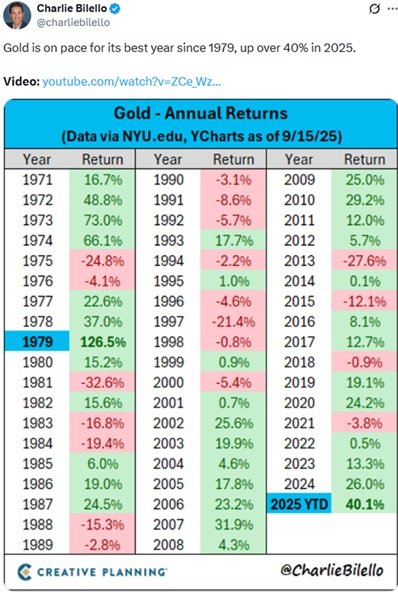 And Gold is having its best year since 1979, as analyst Charlie Bilello’s chart shows: