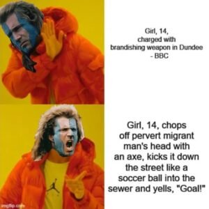 Cue Up: A 14-year-old Scottish girl was ARRESTED for picking up a knife to defend herself and her sister from a migrant who was stalking and filming her.