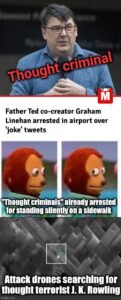 So, get this…an Irish comic writer (and co-creator of the sitcom “Father Ted”) posting comments while in America criticizing a trans-identified male, was arrested by British police in England and faces charges of harassment and criminal damage against a trans woman…or man?