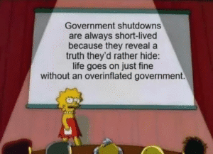 Along that same line of thinking, what we are seeing is a revelation of how overinflated our government truly is and despite some inconveniences resulting from being shut down, life goes on.