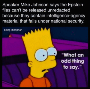 In other news last week, the ongoing melodrama of the Epstein Files has taken on a new twist with Speaker of the House Mike Johnson telling the Presstitutes that the files must be redacted/scrubbed clean before being released.