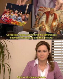 But, as we mentioned above, the Distraction de Jour meter was tripping the red line with Liberal accusations of Trump casting himself as deity with memes about him in the role of Jesus, posted on his Truth Social Network.