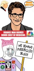 As expected, the Liberal Presstitutes (led by Rachel MadCow) couldn’t figure out how this was a good thing for America and only found fault over the thought of lowering prescription prices… Brainwashing Wokesters in the process.