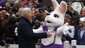 And let’s not forget how during an Easter celebration, Dementia Joe was interrupted by an aide in an Easter Bunny costume while speaking to journalists about Afghanistan and Pakistan.